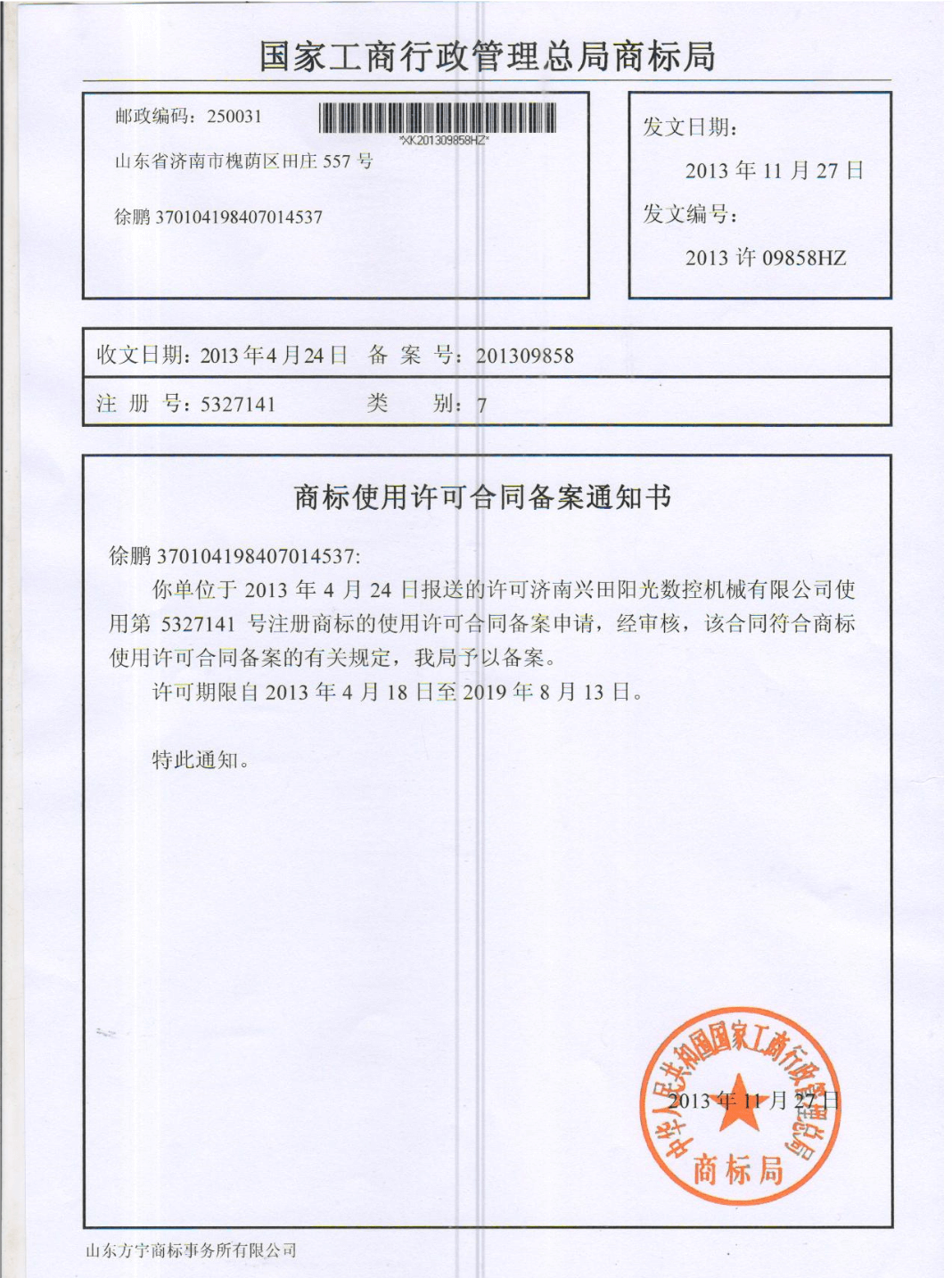 商标使用许可合同备案通知书