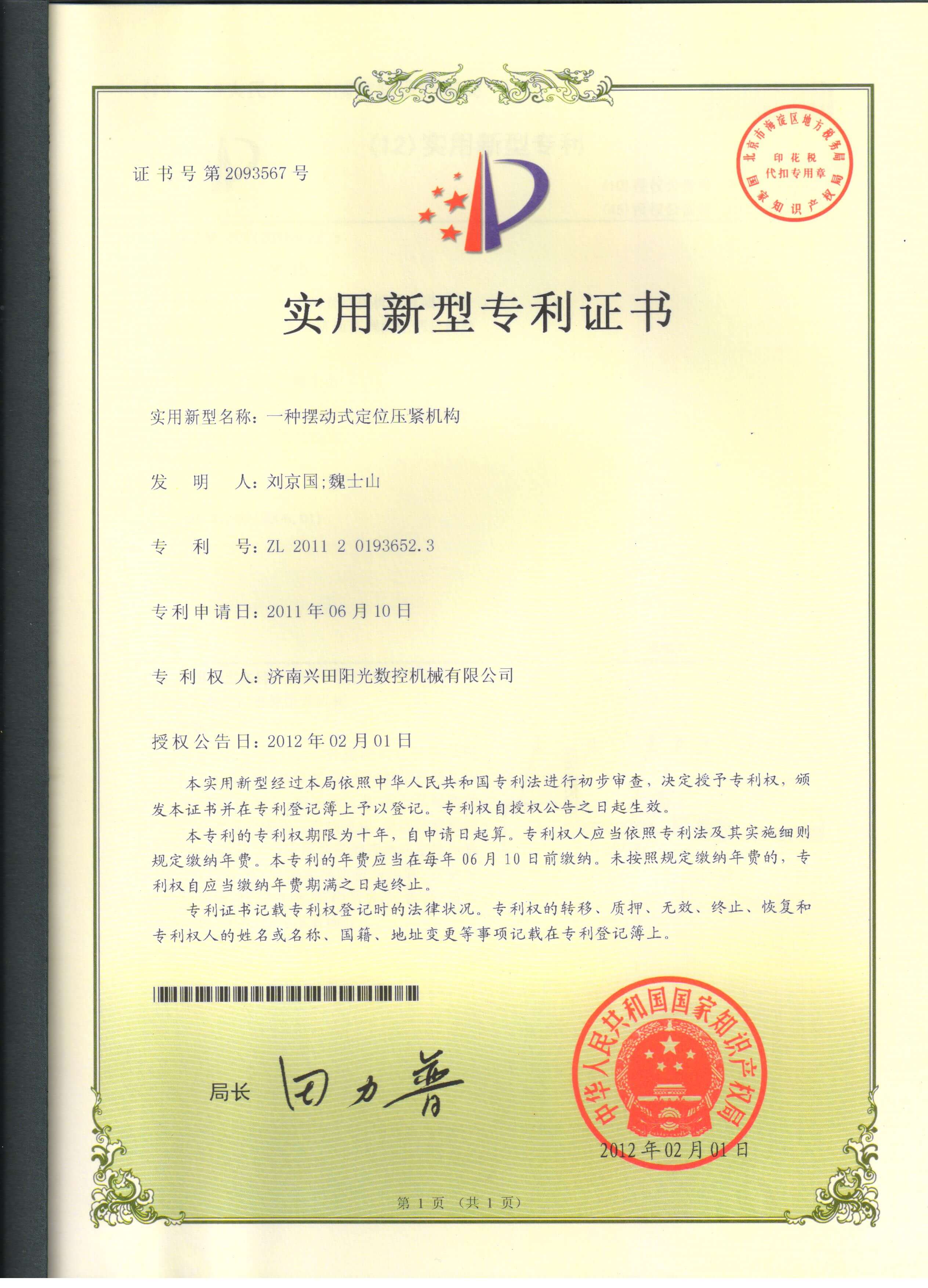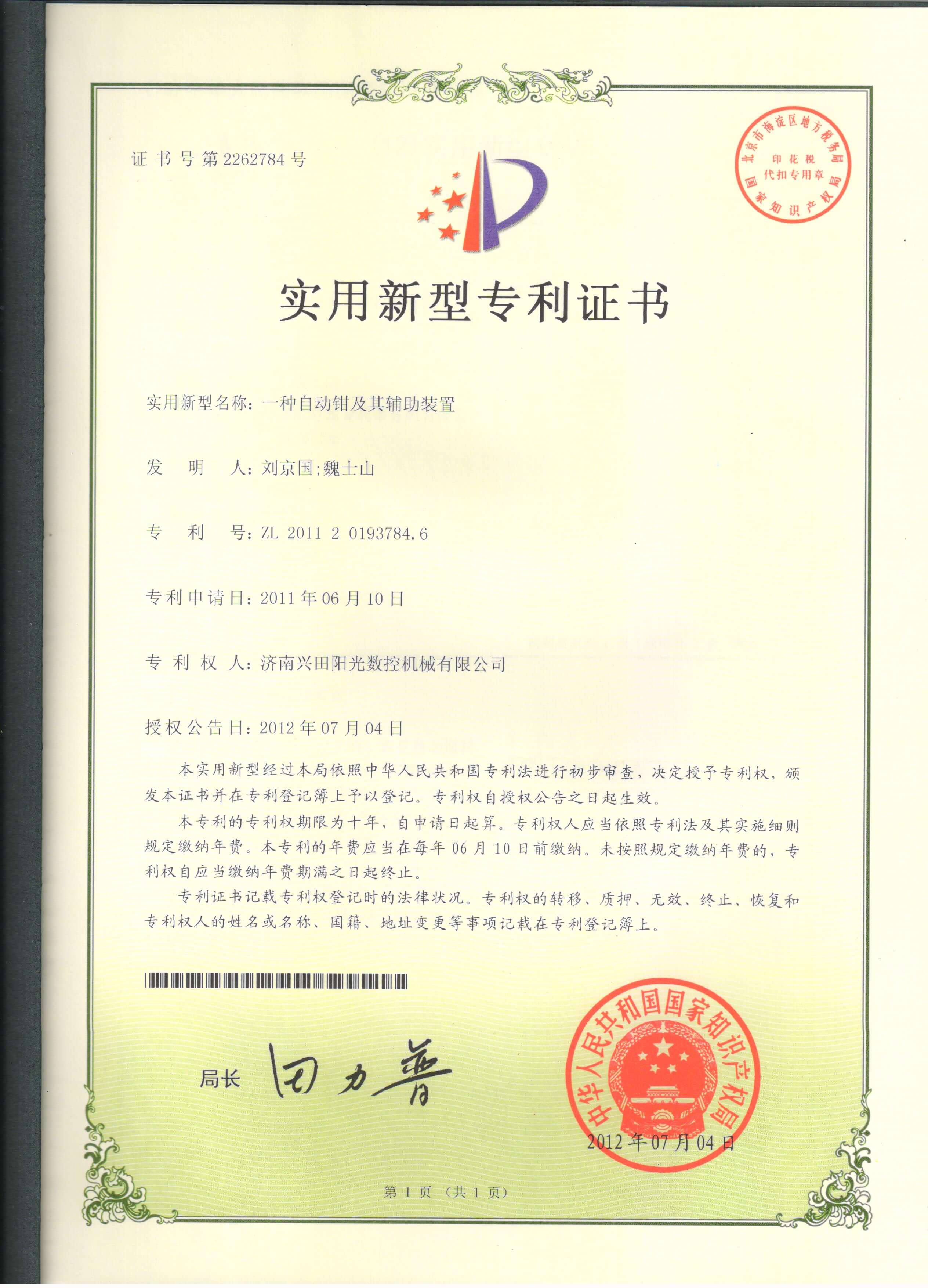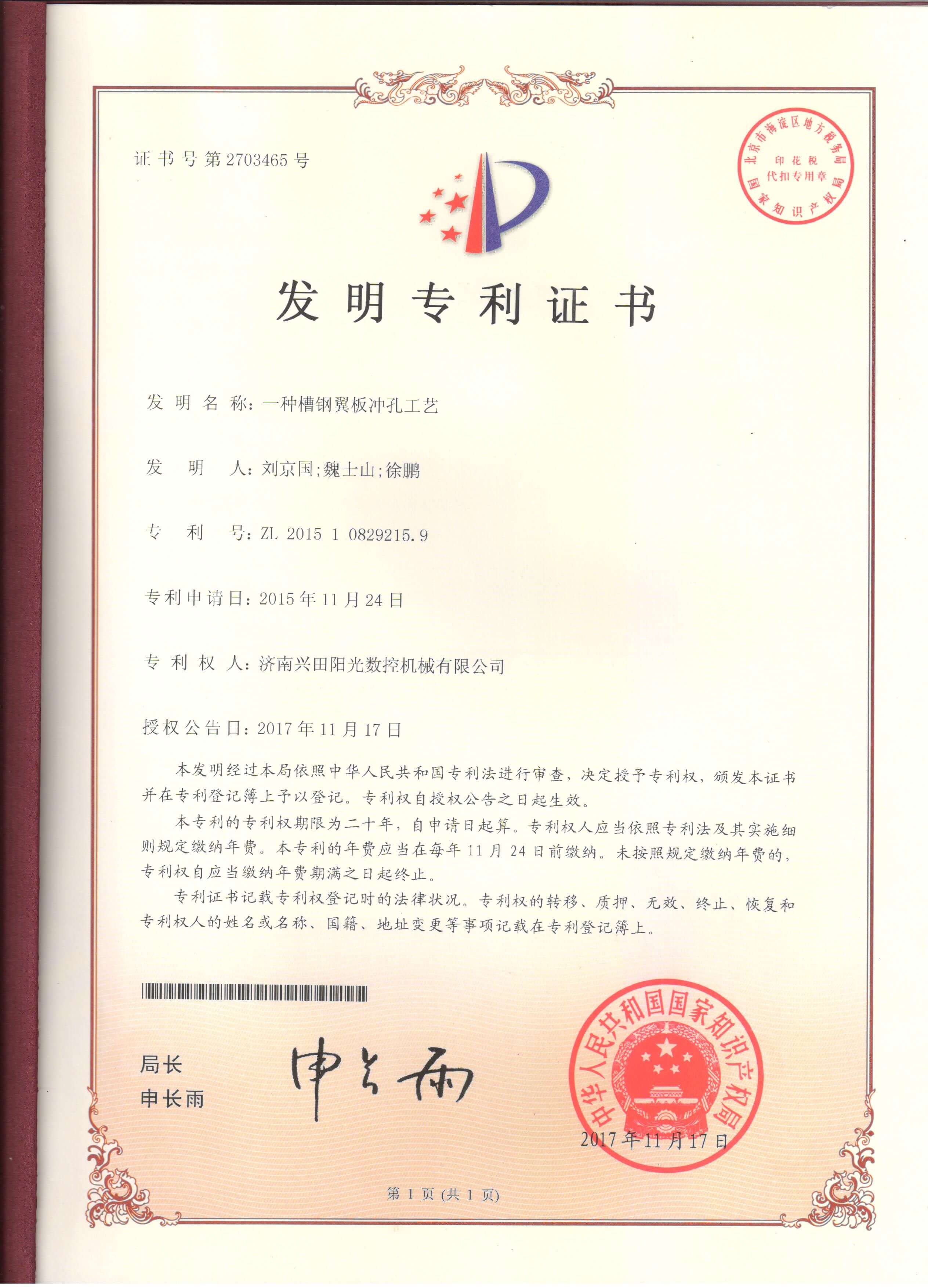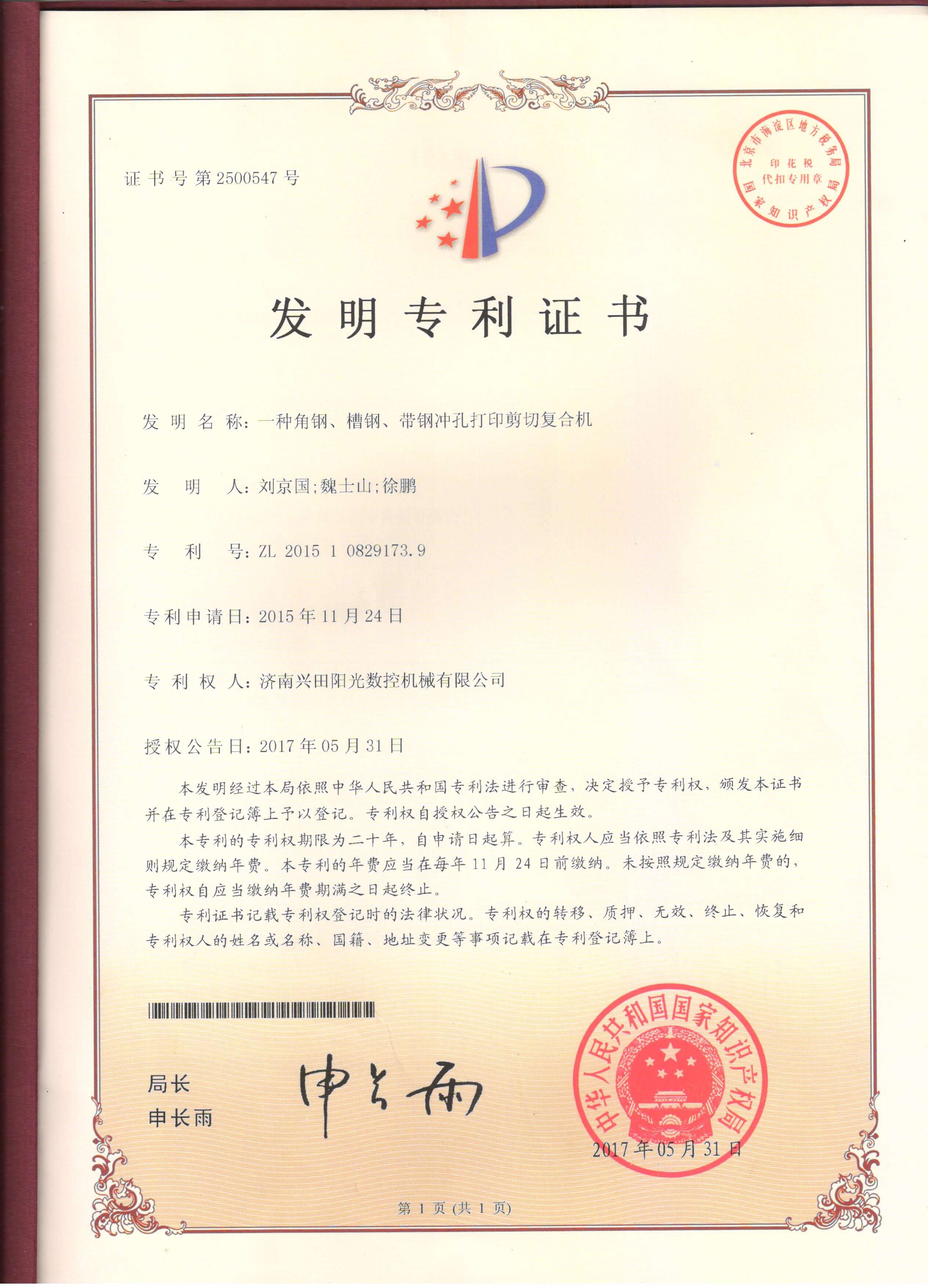 • 专利证书